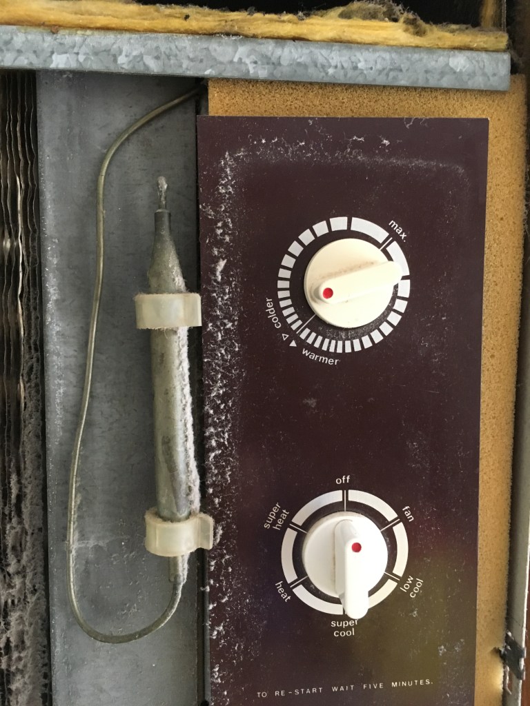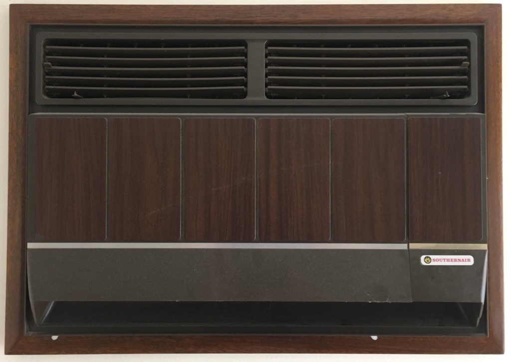Basically the interior section, or the ‘guts’ of these old aircon units slide, from inside the room, into a metal ‘sleeve’ section that has been installed from the outside of the house, screwed into the studs/noggins and bolted onto the outside wall. Then a fancy faux wood veneer control panel goes on the front and bob’s your uncle. So, I first removed said faux wood panel (revealing some weird soldering iron/pen looking thing),