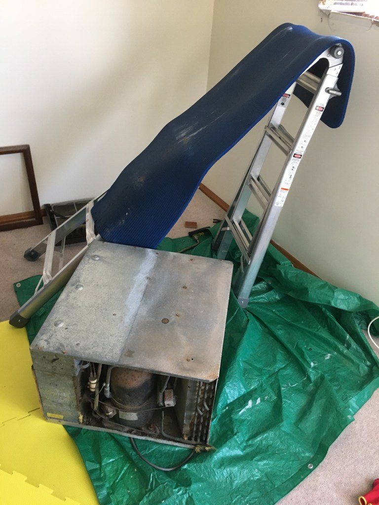 This turned out to be using a ladder. Now I do a lot of dumb shit and have many times gone through with something and THEN thought about better ways to do it (stay tuned for a classic example!) but I was quite proud of this plan. Given I’m reasonably broken: dodgy back, dodgy wrist, golfer’s elbow, crappy left shoulder etc etc… there was no way I was going to be able to lift it down. One of the better videos I watched showed a bloke with lots of tools and timber and time (none of which I had much of) building a timber-frame ramp under the unit so he and his wife could slide it down safely after they got it out. I could’ve potentially jerry-rigged up a much shittier version out of decaying old timber scraps from the backyard but just as likely it would’ve collapsed and squished my toes or some shit. So what I decided on was using my adjustable ladder* (which I highly recommend buying if you need a ladder, mine was under $400 from memory and worth every cent).