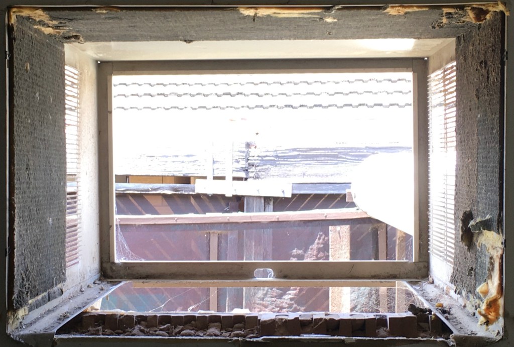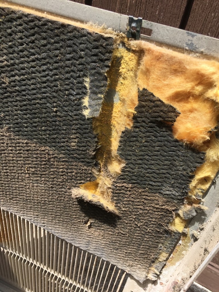 So beyond dust and a lonesome spider, I also discovered that all the surfaces of the interior of the metal sleeve that the unit sat in was insulated with a yellow fibrous material with a black outer layer, and in the removal of the unit, it had been ripped and fibres had been dislodged and dispersed into the atmosphere (trying to sound smart again). At this stage, as the breeze blew through the hole in the wall into the lounge room I thought little about it. “ah yeah, fibreglass insulation no worries” or something along those lines.